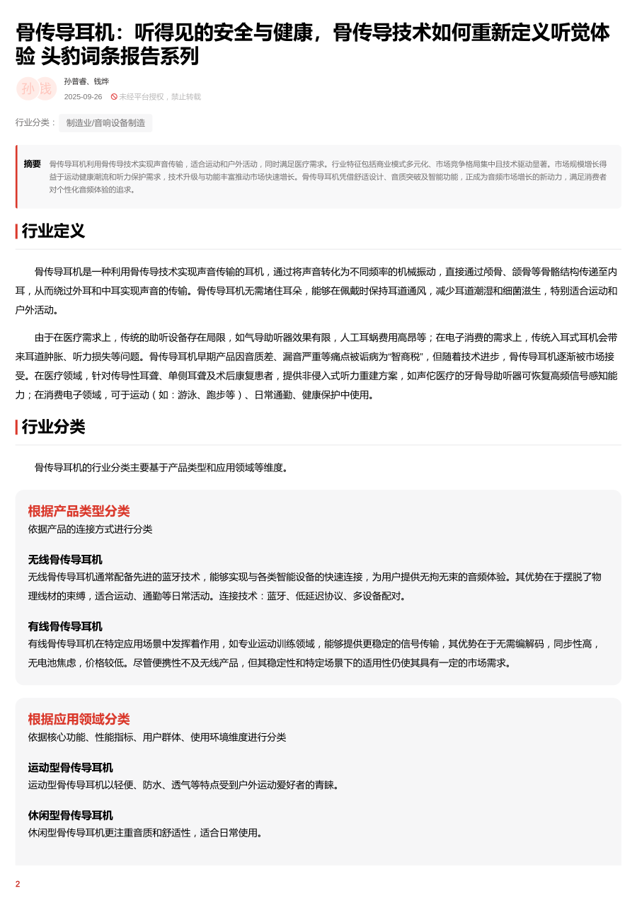 骨传导耳机的行业分类主要基于产品类型和应用领域等维度。