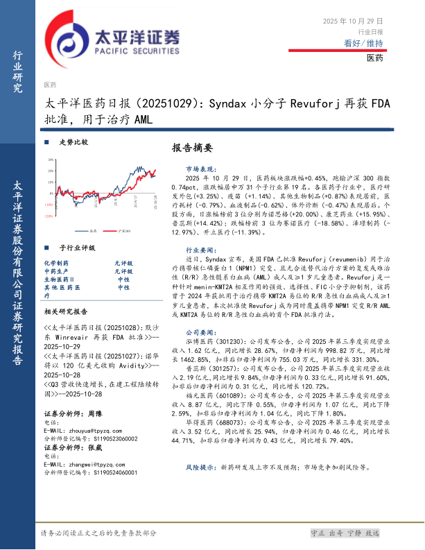 医药日报:Syndax小分子Revuforj再获FDA批准,用于治疗AML