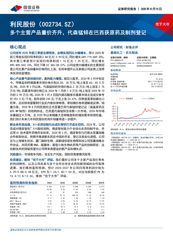 投资建议:维持“优于大市”评级。我们看好公司多个主营产品涨价带来的利润弹性,以及公司未来与多个合作伙伴在农药创新领域的合作取得进展。我们维持盈利预测,预计2025-2027年公司归母净利润分别为5.29/5.88/6.48亿元,EPS为1.26/1.40/1.54元,对应当前股价PE为15.4/13.8/12.6X,维持“优于大市”评级。
