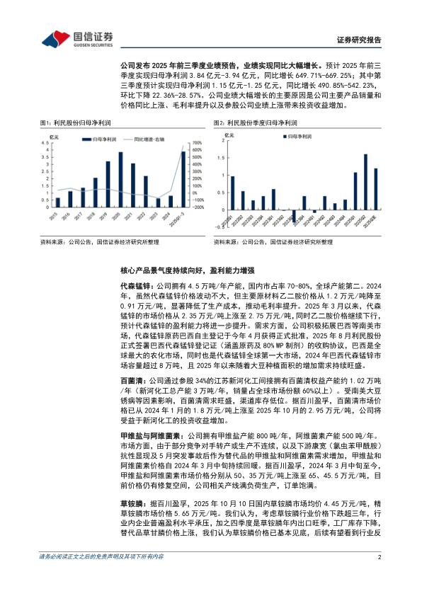 核心产品景气度持续向好,盈利能力增强。据百川盈孚,2024年3月中旬至今,甲维盐和阿维菌素市场价格分别从50、35万元/吨上涨至65、45.5万元/吨;2025年3月以来,代森锰锌的市场价格从2.35万元/吨上涨至2.75万元/吨;百菌清市场价格已从2024年1月的1.8万元/吨上涨至2025年10月的2.95万元/吨;2025年7月4日国内酒石酸泰乐菌素市场主流成交参考价292.5元/千克,较年初的235元/千克上涨24.47%。四季度是草铵膦出口旺季,且后续有望看到行业反内卷自律举措,草铵膦价格有望触底反弹。销量方面,2025年8月利民股份正式签署巴西代森锰锌登记证(涵盖原药及80%WP制剂)的收购协议,巴西是代森锰锌全球第一大市场,2024年市场容量超过8万吨,且2025年以来随着大豆种植面积的增加需求持续旺盛,我们预计未来几年利民股份的海外销量将进一步提升。