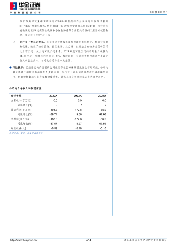 同行业上市公司对比:公司专注于肿瘤等疾病领域创新药研发;根据业务的相似性,选取了迪哲医药、微芯生物、艾力斯、以及益方生物为必贝特的可比上市公司。从上述可比公司来看,2024年度可比公司的平均收入规模为11.86亿元、销售毛利率为94.44%;相较而言,公司报告期内尚未产生营业收入和营业成本,与可比公司存在一定差异。
