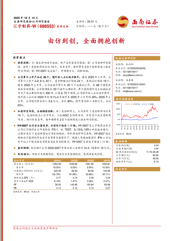公司累计上市产品达43个,境外收入占比逐步提升。截至2025年上半年,公司累计上市产品数量达43个,其中肿瘤治疗领域24个,其他治疗领域19个。截至2025年上半年,公司在海外累计共25个产品获批上市,在68个国家和地区实现销售;公司新增获批50个海外注册批件,累计获得国外自主和授权合作方产品注册批件超过450项,已覆盖70个国家。公司境外收入占比逐步提升,境外收入占比由2023年的9.1%逐步提升至2025年上半年的20%。2025年上半年,公司境内营业收入3.6亿元,占比80%;境外营业收入0.9亿元,占比20%。