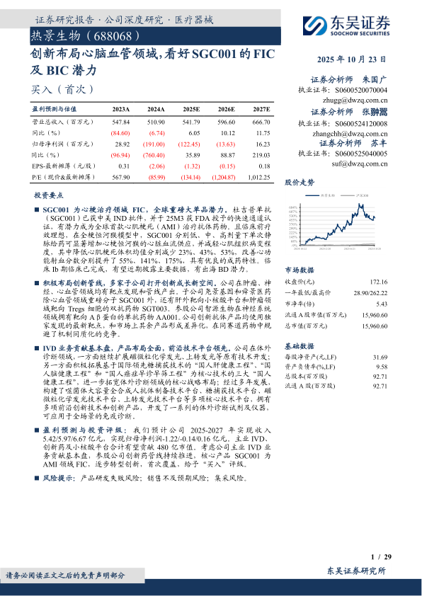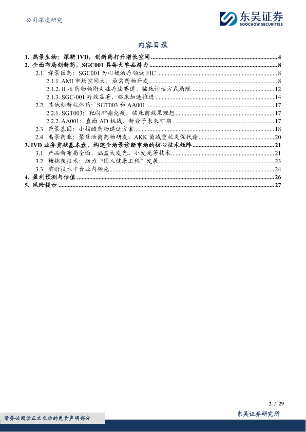 盈利预测与投资评级:我们预计公司2025-2027年实现收入5.42/5.97/6.67亿元,实现归母净利润-1.22/-0.14/0.16亿元。主业IVD、创新药及小核酸平台合计有望贡献480亿市值。考虑公司主业IVD业务贡献基本盘,参股公司创新药管线持续推进,核心产品SGC001为AMI领域FIC,逐步转型创新,首次覆盖,给予“买入”评级。