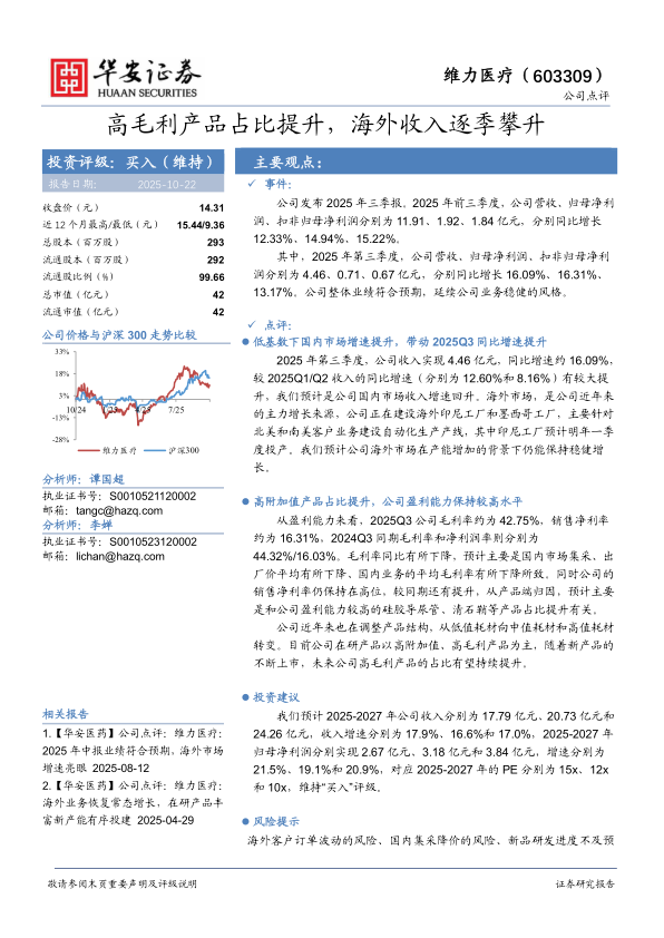我们预计2025-2027年公司收入分别为17.79亿元、20.73亿元和24.26亿元,收入增速分别为17.9%、16.6%和17.0%,2025-2027年归母净利润分别实现2.67亿元、3.18亿元和3.84亿元,增速分别为21.5%、19.1%和20.9%,对应2025-2027年的PE分别为15x、12x和10x,维持“买入”评级。