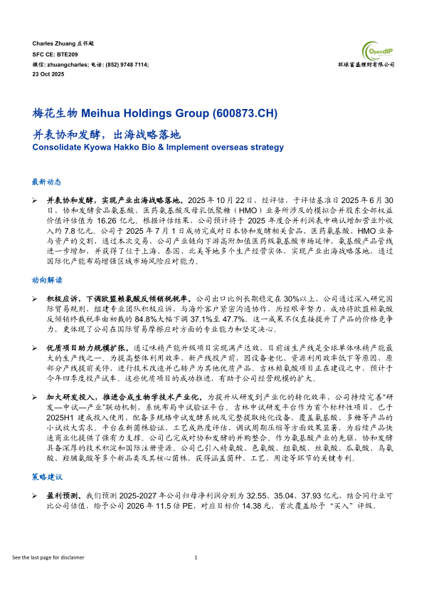 并表协和发酵,实现产业出海战略落地。2025年10月22日,经评估,于评估基准日2025年6月30日,协和发酵食品氨基酸、医药氨基酸及母乳低聚糖(HMO)业务所涉及的模拟合并股东全部权益价值评估值为16.26亿元。根据评估结果,公司预计将于2025年度合并利润表中确认增加营业外收入约7.8亿元。公司于2025年7月1日成功完成对日本协和发酵相关食品、医药氨基酸、HMO业务与资产的交割,通过本次交易,公司产业链向下游高附加值医药级氨基酸市场延伸,氨基酸产品管线进一步增加,并获得了位于上海、泰国、北美等地多个生产经营实体,实现产业出海战略落地,通过国际化产能布局增强区域市场风险应对能力。