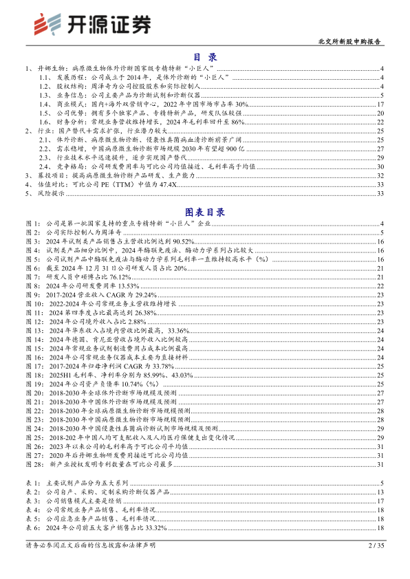 丹娜生物主要从事侵袭性真菌病血清学早期诊断及其它病原微生物体外诊断产品的研发、生产和销售,被认定为国家高新技术企业、第一批国家支持的重点专精特新“小巨人”企业、天津市制造业单项冠军企业、国家知识产权优势企业。公司2017-2024年营业收入与归母净利润CAGR分别为29.24%、33.78%,常规业务维持持续增长。2024年公司的营业收入为2.40亿元,同比增加1.21%;归母净利润为8,719万元,同比增加12%。公司盈利能力较好,2024年毛利率、净利率分别为86%、36%。2022年公司在中国侵袭性真菌病诊断试剂市场的份额约为30%。公司终端用户以三级医院为主,截至2024年12月末,公司试剂产品已进入全国1,200多家医疗机构,其中三级医院900多家。