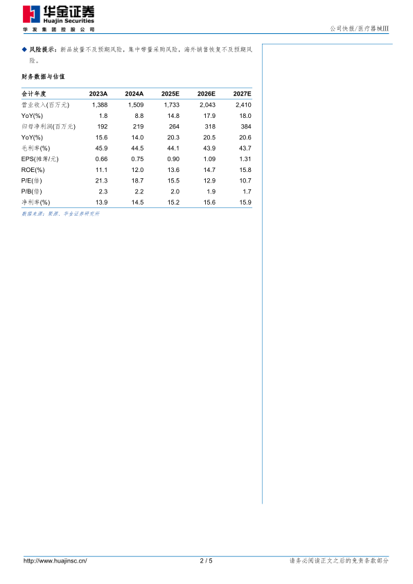 风险提示:新品放量不及预期风险,集中带量采购风险,海外销售恢复不及预期风险。