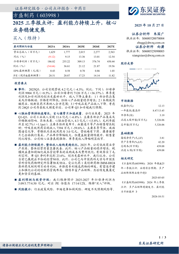 事件:2025Q3,公司实现营收4.2亿元(-4.3%,同比,下同),归母净利润9904万元(+8.5%),扣非归母净利7120万元(+36.37%),单季度利润及扣非利润均创历史最好水平。收入下降主要系:1)部分药品集采及价格联动,价格有所降低,但核心产品销量稳步增长;2)本期筱熊猫药业、锐新医药不再纳入合并范围;3)呼吸品类产品收入下降。考虑到24Q3公司存在较大额度非经,公司单Q3扣非超我们预期。