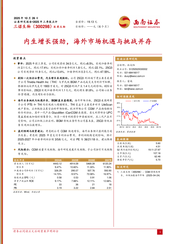 海外业务挑战与机遇并存,BGM基本盘稳固。海外市场方面,25Q3美国两家子公司PTS和THI均实现收入稳健增长,THI受益于主要竞争对手LifeScan破产重组,正积极抢占其空出的市场份额。欧洲市场公司CGM产品面临雅培的专利诉讼,其中一代产品GlucoMeniCanCGM在德国、意大利等部分UPC覆盖国被施加临时销售禁令,但另一项专利的禁令申请被驳回,且二代产品不受影响,公司正积极上诉应对。BGM传统业务作为公司基本盘,25Q3传统业务实现双位数增长。