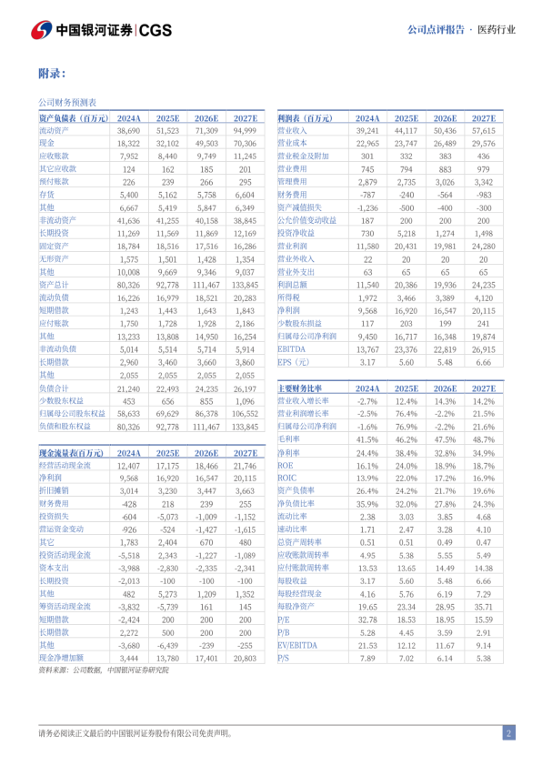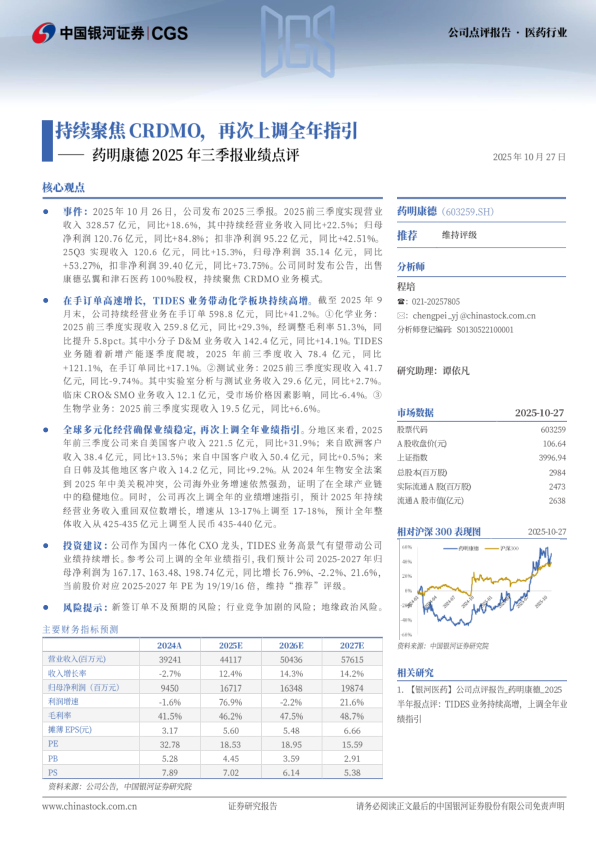 投资建议:公司作为国内一体化CXO龙头,TIDES业务高景气有望带动公司业绩持续增长。参考公司上调的全年业绩指引,我们预计公司2025-2027年归母净利润为167.17、163.48、198.74亿元,同比增长76.9%、-2.2%、21.6%,当前股价对应2025-2027年PE为19/19/16倍,维持“推荐”评级。