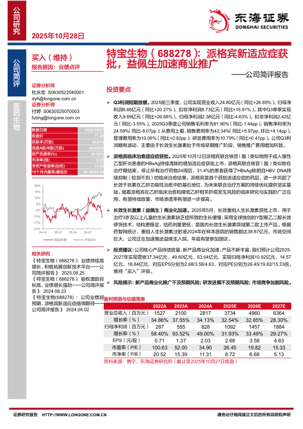 Q3利润短期放缓。 2025前三季度,公司实现营业收入24.80亿元( 同比+26.85%)、归母净利润6.66亿元( 同比+20.21%)、扣非净利润6.73亿元( 同比+15.91%)。其中Q3单季实现收入9.69亿元( 同比+26.68%),归母净利润2.38亿元( 同比-4.63%), 扣非净利润2.42亿元( 同比-3.55%)。 2025Q3季度公司销售毛利率为91.90%( 同比-1.44pp), 销售净利率为24.59%( 同比-8.07pp); 从费用上看, 销售费用率为42.34%(同比+5.97pp,环比+4.14pp),管理费用率为10.06%(同比+0.82pp);研发费用率为10.79%(同比+0.41pp)。 公司Q3利润略有波动,主要由于长效生长激素处于市场早期推广阶段,销售推广费用增加所致。