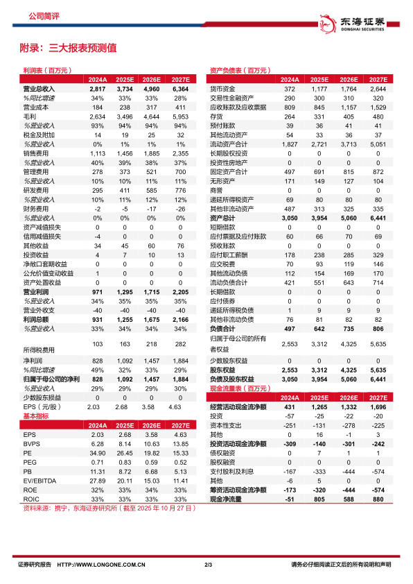 投资建议: 公司核心产品持续放量, 新产品商业化加速, 产品不断丰富, 我们预计公司2025-2027年实现营收37.34亿元、 49.60亿元、 63.64亿元,实现归母净利润10.92亿元、 14.57亿元、 18.84亿元,对应EPS分别为2.68/3.58/4.63,对应PE分别为26.45/19.82/15.33倍。维持“买入” 评级。
