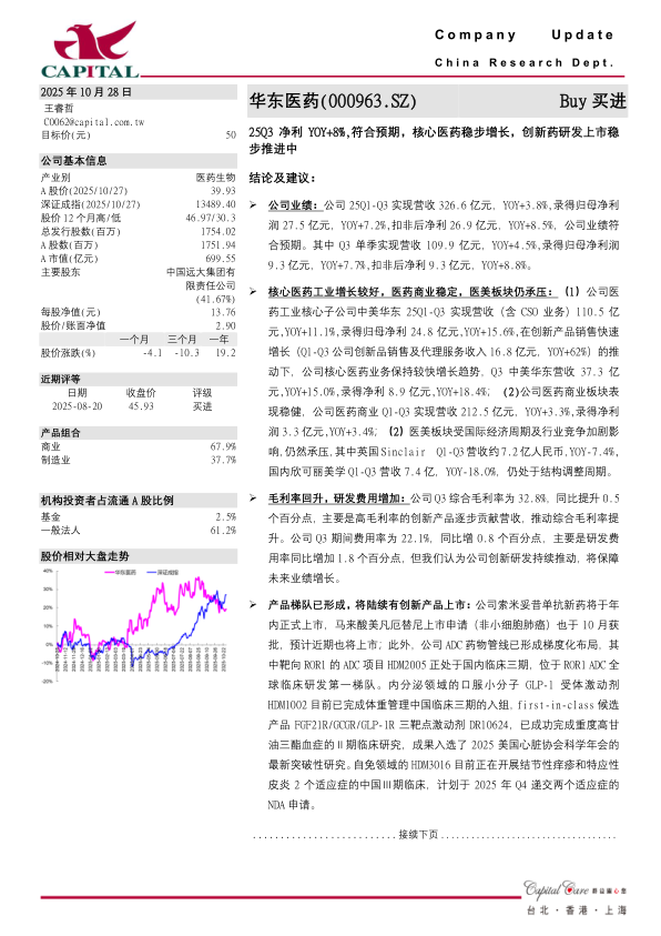 25Q3净利YOY+8%,符合预期,核心医药稳步增长,创新药研发上市稳步推进中