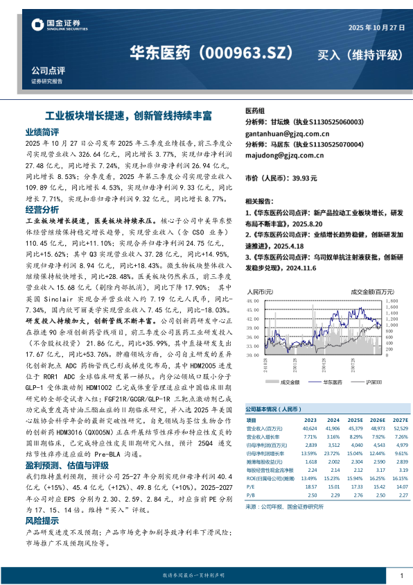 工业板块增长提速,医美板块持续承压。核心子公司中美华东整体经营继续保持稳定增长趋势,实现营业收入(含CSO业务)110.45亿元,同比+11.10%;实现合并归母净利润24.75亿元,同比+15.62%;其中Q3实现营业收入37.28亿元,同比+14.95%,实现归母净利润8.94亿元,同比+18.43%。微生物板块整体收入继续保持较快增长,同比+28.48%。医美板块仍然承压,前三季度营业收入15.68亿元(剔除内部抵消),同比下降17.90%;其中英国Sinclair实现合并营业收入约7.19亿元人民币,同比-7.34%,国内欣可丽美学实现营业收入7.45亿元,同比-18.03%。研发投入持续加大,创新管线不断丰富。公司创新药研发中心正在推进90余项创新药管线项目,前三季度公司医药工业研发投入(不含股权投资)21.86亿元,同比+35.99%,其中直接研发支出17.67亿元,同比+53.76%。肿瘤领域方面,公司自主研发的差异化创新靶点ADC药物管线已形成梯度化布局,其中HDM2005进度位于ROR1ADC全球临床研发第一梯队。内分泌领域口服小分子GLP-1受体激动剂HDM1002已完成体重管理适应症中国临床Ⅲ期研究的全部受试者入组;FGF21R/GCGR/GLP-1R三靶点激动剂已成功完成重度高甘油三酯血症的Ⅱ期临床研究,并入选2025年美国心脏协会科学年会的最新突破性研究。自免领域与荃信生物合作的创新药HDM3016(QX005N)正在开展结节性痒疹和特应性皮炎的国Ⅲ期临床,已完成特应性皮炎Ⅲ期研究入组,预计25Q4递交结节性痒疹适应症的Pre-BLA沟通。