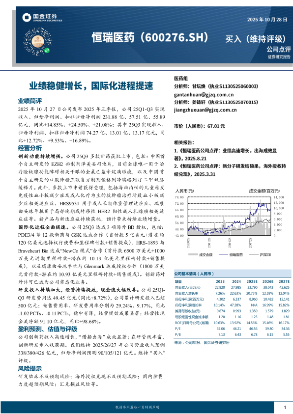 创新动能持续增强。公司25Q3多款新药获批上市,包括:中国首个自主研发的EZH2抑制剂泽美妥司他片,目前全球唯一用于治疗睑板腺功能障碍相关干眼的全氟己基辛烷滴眼液,以及中国首个自主研发的口服降糖三联复方制剂恒格列净瑞格列汀二甲双胍缓释片。此外,多款上市申请获得受理,包括海曲泊帕的儿童原发免疫性血小板减少症及成人化疗为主的抗肿瘤治疗所致血小板减少症相关适应症、HRS9531用于成人长期体重管理适应症、瑞康曲妥珠单抗用于局部晚期或转移性HER2阳性成人乳腺癌相关适应症等。新产品与新适应症持续获批,预计带来持续业绩增量。国际化进程全面提速。公司25Q3达成3项海外BD授权,包括:PDE3/4等12款新药与GSK达成合作(首付款5亿美元+潜在约120亿美元选择权行使费和里程碑付款+销售提成),HRS-1893与Braveheart Bio达成“NewCo模式”合作(首付款6500万美元+1000万美元近期里程碑款+潜在约10.13亿美元里程碑付款+销售提成),以及瑞康曲妥珠单抗与Glenmark达成授权合作(1800万美元首付款+潜在约10.93亿美元里程碑付款+销售提成)。创新药对外许可已成为公司常态化业务。