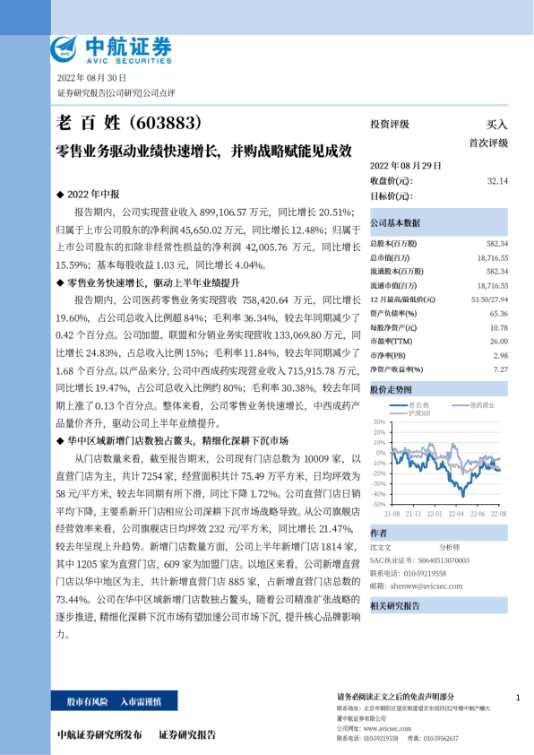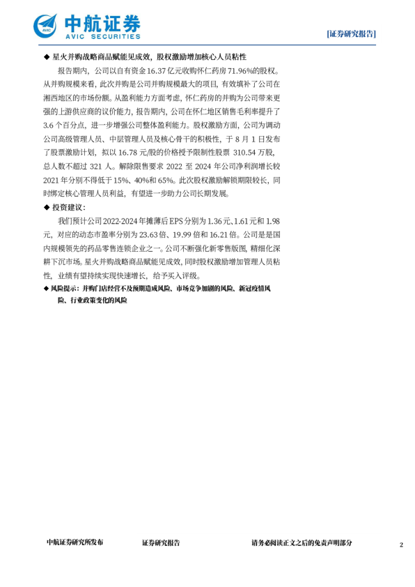 我们预计公司2022-2024年摊薄后EPS分别为1.36元、1.61元和1.98元、对应的动态市盈率分别为23.63倍、19.99倍和16.21倍。公司是是国内规模领先的药品零售连锁企业之一。公司不断强化新零售版图,精细化深耕下沉市场。星火并购战略商品赋能见成效,同时股权激励增加管理人员粘性,业绩有望持续实现快速增长,给予买入评级。