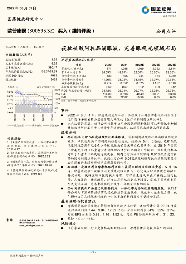 公司获批0.01%浓度硫酸阿托品滴眼液。获批制剂硫酸阿托品滴眼液的适应症为,降低近距离工作引起的短暂性近视,规格为5ml:0.5mg。0.01%低浓度阿托品用于儿童青少年近视进展的临床研究已有多年,在2019年国家卫健委发布的《儿童青少年近视防控适宜技术指南》中提到:低浓度阿托品可用于儿童青少年减缓近视进展。国内已有其他医院取得0.01%低浓度阿托品的院内制剂注册批件。我们认为公司0.01%浓度硫酸阿托品滴眼液有望与公司现有的角膜塑形镜产品形成协同作用。