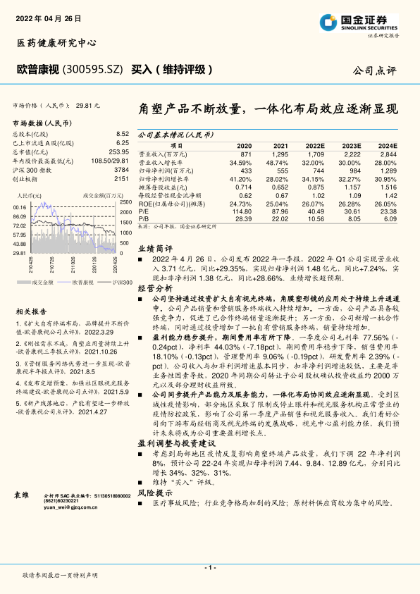 公司同步提升产品能力及服务能力,一体化布局协同效应逐渐显现。受到区域性疫情影响,部分地区采取了限制或停止眼科和视光服务机构正常营业的疫情防控政策,影响了公司第一季度产品销售和视光服务收入。我们看好公司向下游布局经销商及视光终端的发展战略,视光中心盈利能力强,我们预计未来将成为公司重要盈利增长点。