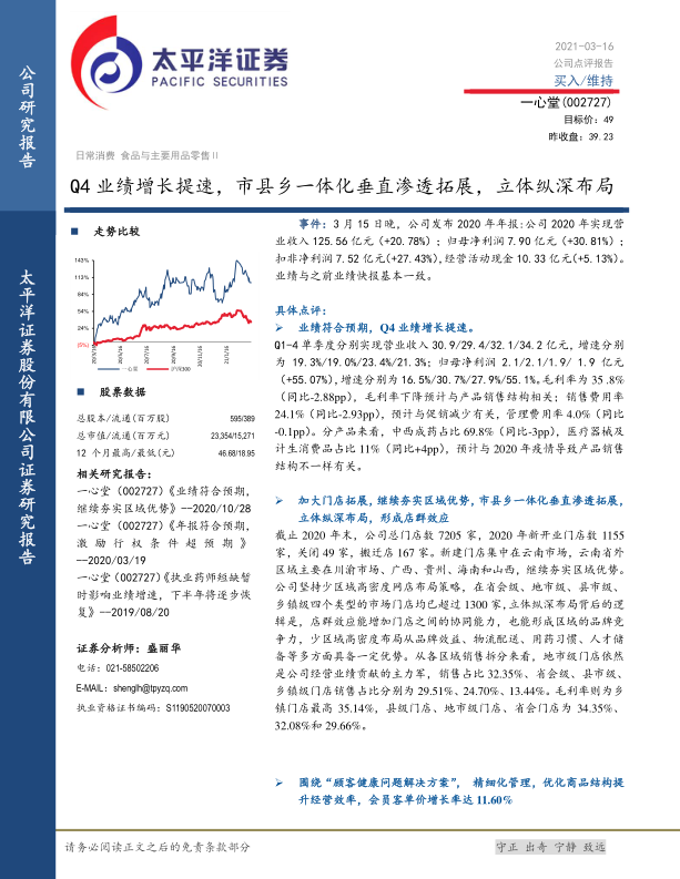 Q1-4单季度分别实现营业收入30.9/29.4/32.1/34.2亿元,增速分别为19.3%/19.0%/23.4%/21.3%;归母净利润2.1/2.1/1.9/1.9亿元(+55.07%),增速分别为16.5%/30.7%/27.9%/55.1%。毛利率为35.8%(同比-2.88pp),毛利率下降预计与产品销售结构相关;销售费用率24.1%(同比-2.93pp),预计与促销减少有关,管理费用率4.0%(同比-0.1pp)。分产品来看,中西成药占比69.8%(同比-3pp),医疗器械及计生消费品占比11%(同比+4pp),预计与2020年疫情导致产品销售结构不一样有关。
