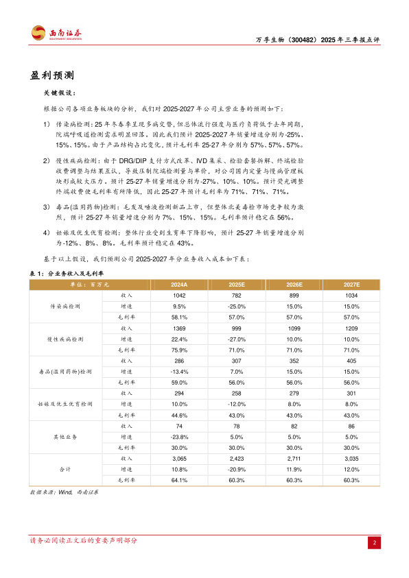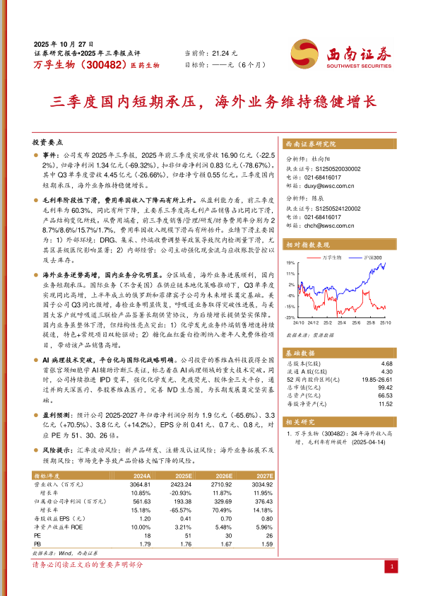 海外业务逆势高增,国内业务分化明显。分区域看,海外业务进展顺利,国内业务短期承压。国际业务(不含美国)在供应链本地化策略推动下,Q3单季度实现同比高增,上半年成立的俄罗斯和菲律宾子公司为未来增长奠定基础。美国子公司Q3同比微增,毒检业务明显恢复,呼吸道业务取得突破性进展,与美国大客户就呼吸道三联检产品签署长期供货协议,为后续增长提供坚实保障。国内业务虽整体下滑,但结构性亮点突出:1)化学发光业务终端销售增速持续提速,特色+常规项目双轮驱动;2)糖化血红蛋白检测纳入老年人免费体检项目,带动该产品销售高增。