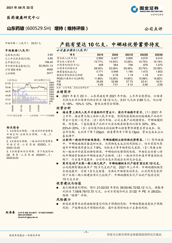药用包材产业园一期工程已投产, 中硼硅模制系列产能有望达到 10 亿支。公司现拥有模抗瓶年产 70 多亿支的产能。 2021 年上半年, 中硼硅模制瓶需求快速提升,实现 1.5 亿支销售。 为满足市场增长的需求, 公司药用包装材料产业园一期工程建设项目已经投产,中硼硅模制系列产品的产能将达到10 亿支左右。