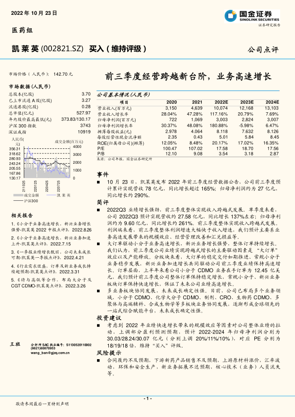 10 月 23 日,凯莱英发布 2022 年前三季度经营数据公告,公司前三季度预计累计实现营收 78 亿元,同比增长超过 165%;归母净利润约为 27 亿元,同比增长约 290%。