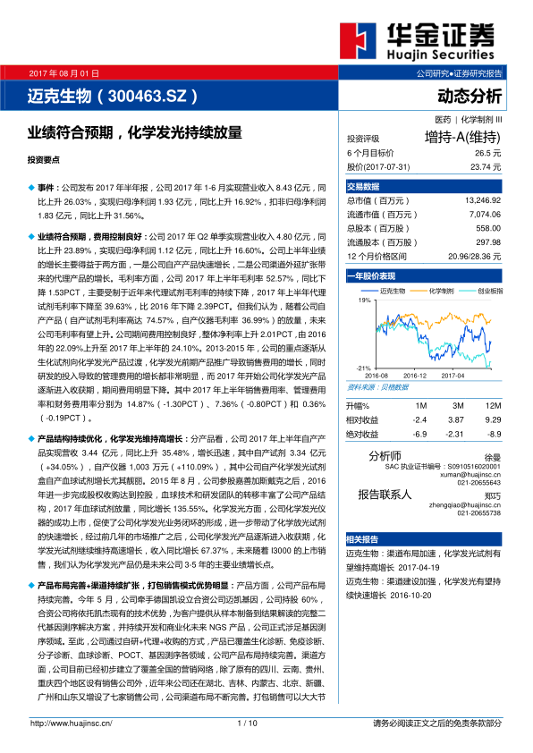 业绩符合预期,化学发光持续放量