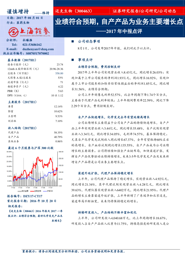 2017年中报点评:业绩符合预期,自产产品为业务主要增长点