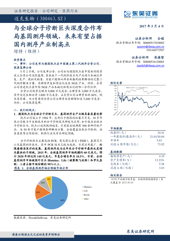 与全球分子诊断巨头深度合作布局基因测序领域,未来有望占据国内测序产业制高点