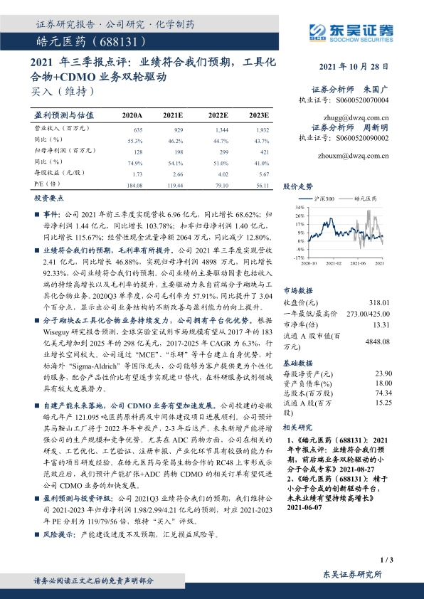 2021年三季报点评:业绩符合我们预期,工具化合物+CDMO业务双轮驱动