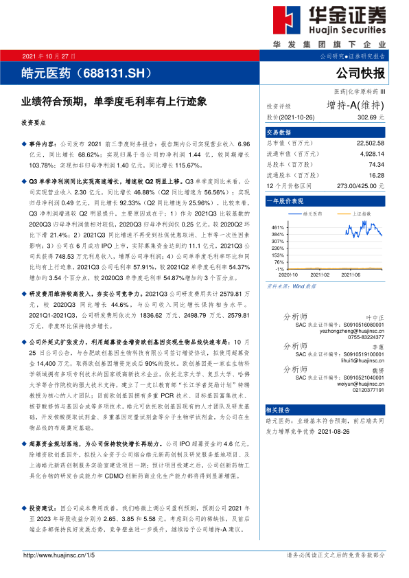 超募资金规划落地,为公司保持较快增长再助力。公司IPO超募资金约4.6亿元,除增资欧创基因外,拟投入全资子公司烟台皓元新药创制及研发服务基地项目、及上海皓元新药创制服务实验室建设项目一期;预计项目投建之后,公司创新药物工具化合物的研发合成能力和CDMO创新药商业化生产能力都将得到显著增强。