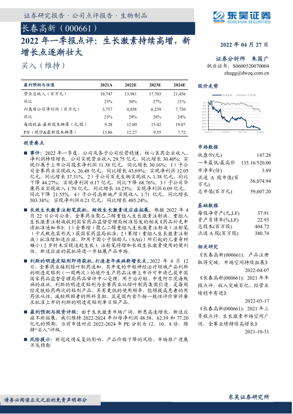 盈利预测与投资评级:由于生长激素市场广阔,新患高速增长,新适应症不断拓展,我们维持2022-2024年归母净利润48.58、62.39和77.20亿元的预期,当前市值对应2022-2024年PE分别为12、10、8倍,维持“买入”评级。