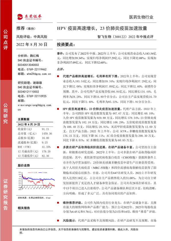 2022年中报点评:HPV疫苗高速增长,23价肺炎疫苗加速放量