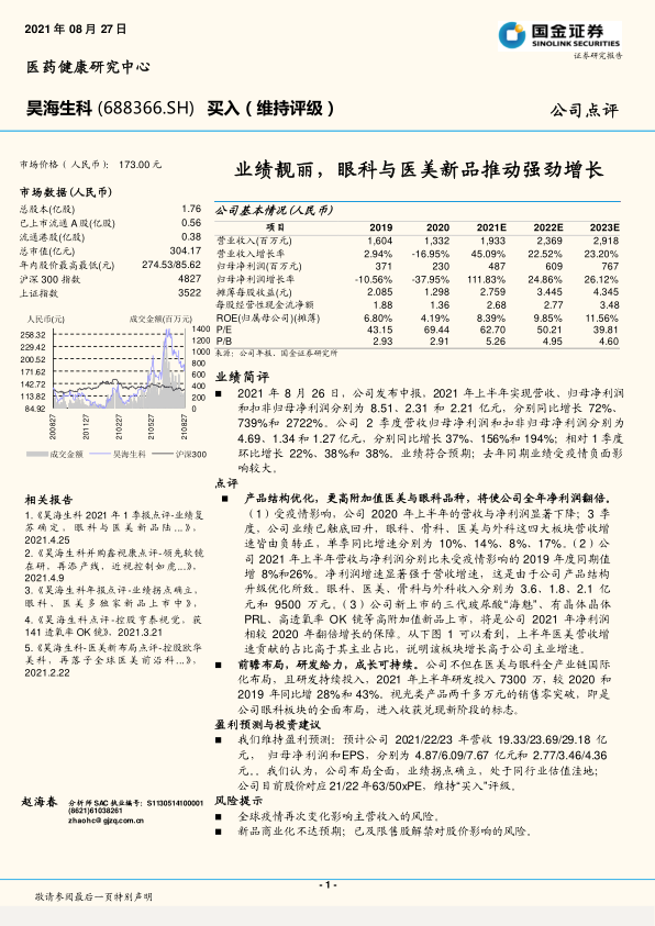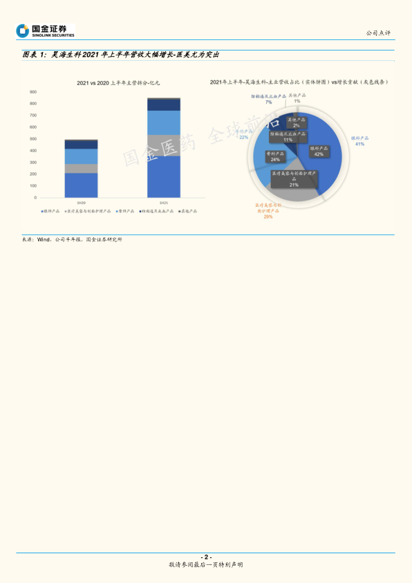 前瞻布局,研发给力,成长可持续。公司不但在医美与眼科全产业链国际化布局,且研发持续投入,2021 年上半年研发投入 7300 万,较 2020 和2019 年同比增 28%和 43%。视光类产品两千多万元的销售零突破,即是公司眼科板块的全面布局,进入收获兑现新阶段的标志。