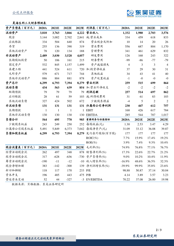 盈利预测与投资评级: 我们维持预计公司 2021-2023 年营业收入分别为19.80/27.03/35.76 亿元, 归母净利润分别为 4.47/6.12/7.57 亿元,对应当前市值的 PE 分别为 51X/37X/30X。 维持“买入”评级。