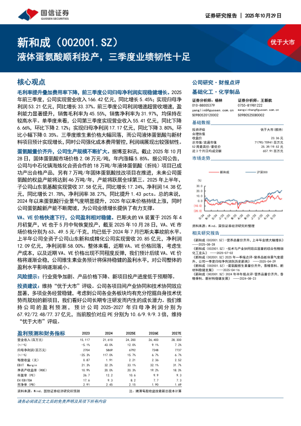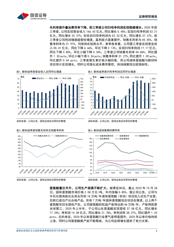 毛利率提升叠加费用率下降,前三季度公司归母净利润实现稳健增长。2025年前三季度,公司实现营业收入166.42亿元,同比增长5.45%;实现归母净利润53.21亿元,同比增长33.37%。前三季度公司利润增速超营收增速,盈利能力显著提升,销售毛利率为45.55%,销售净利率为31.97%,均保持在较高水平。单季度来看,公司第三季度实现营业收入55.41亿元,同比下降6.66%,环比下降2.12%;实现归母净利润17.17亿元,同比下降3.80%,环比小幅下降0.35%。三季度维生素价格大幅回落,而公司液体蛋氨酸与新材料项目预计实现增长,同时公司强化成本费用管控,利润端展现出较强韧性。蛋氨酸量价齐升,公司生产规模不断扩大。据博亚和讯,截止2025年10月28日,固体蛋氨酸市场价格2.08万元/吨,年内涨幅5.85%。据公司公告,公司与中石化镇海炼化合资合作的18万吨/年液体蛋氨酸(折纯)项目已成功产出合格产品,另有7万吨/年固体蛋氨酸技改项目在推进,未来公司蛋氨酸的权益产能将达到46万吨/年,产能将跃居全球第三。2025年上半年,子公司山东氨基酸实现营收37.58亿元,同比增长17.24%,净利润14.38亿元,同比增长21.78%,净利润率38.27%,同比提升1.43pcts。总的来说,2024年以来蛋氨酸行业景气度明显提升,2025年以来价格持续上涨,同时公司蛋氨酸新产能不断爬坡,为公司业绩增长提供了有力支撑。