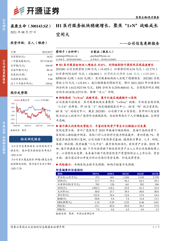 2021H1公司实现营收2.99亿元(+5.42%);归母净利润0.24亿元(-12.17%);扣非净利润-0.07亿元(-126.86%),经营现金流净额0.68亿元(+129.20%)。EPS0.04元/股(-0.01元/股)。医疗服务板块收入实现了稳健增长,2021H1实现营收2.75亿元(+35.8%)。我们维持盈利预测不变,预计2021-2023年归母净利润分别为1.61/2.92/3.94亿元,EPS分别为0.25/0.46/0.61元,当前股价对应P/E分别为65.8/36.3/27.0倍,维持“买入”评级。