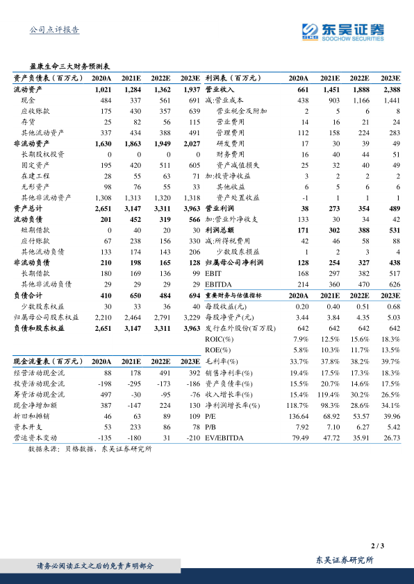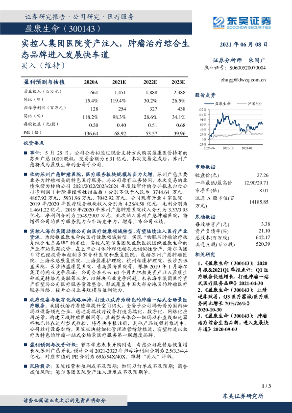 盈利预测与投资评级: 暂不考虑未来并购因素, 考虑公司疫情后恢复增长及苏州广慈并表,预计公司 2021-2023 年归母净利润分别为 2.5/3.3/4.4亿元,对应市值的 PE 分别为 69X/54X/40X。维持“买入”评级。