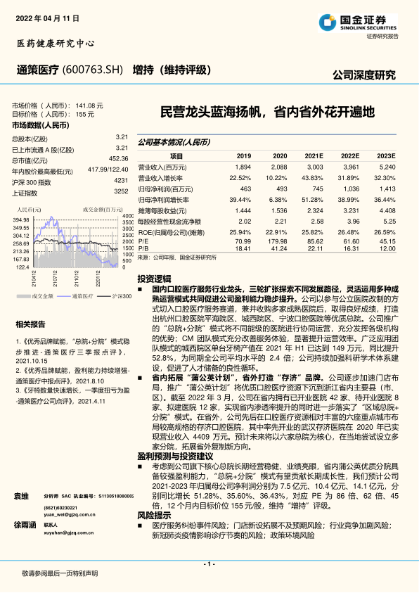 考虑到公司旗下核心总院长期经营稳健、业绩亮眼,省内蒲公英优质分院具备较强盈利能力,“总院+分院”模式有望贡献长期成长性,我们预计公司2021-2023年归属母公司净利润分别为7.5亿元、10.4亿元、14.1亿元,分别同比增长51.28%、35.60%、36.43%,对应PE为86倍、62倍、45倍,12个月内目标价位155元/股,维持“增持”评级。