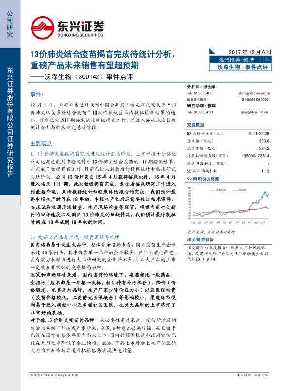 事件点评:13价肺炎结合疫苗揭盲完成待统计分析,重磅产品未来销售有望超预期