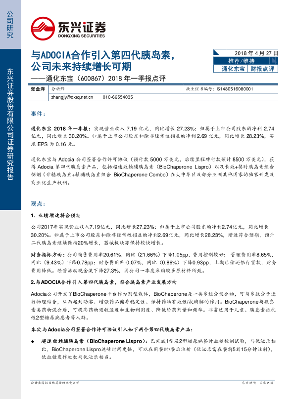 2018年一季报点评:与ADOCIA合作引入第四代胰岛素,公司未来持续增长可期