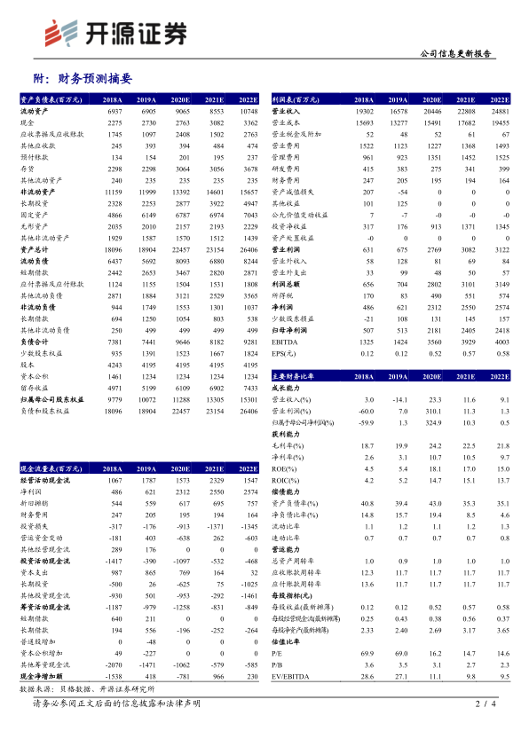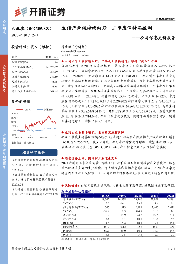 大北农发布 2020 年三季度报告: 第三季度公司实现营业收入 62.75 亿元(+53.74%),归母净利润 5.90 亿元(+119.66%),前三季度实现营业收入 152.66亿元(+24.89%),归母净利润 14.83 亿元(+390.88%)。公司前三季度业绩受高猪价及高养殖积极性影响,同比仍实现较大幅度增长。 饲料业务整体发展态势良好, 能繁母猪环比连续转正,公司高毛利率的前端料占比增加, 三季度饲料单月销量环比实现增长。 生猪养殖业务量价齐升,三季度公司参控股平台合计出栏生猪 45.82 万头(+23.14%),销售均价为 35.49 元/公斤,环比上涨 14.72%。 考虑生猪价格已进入下行阶段,我们预计 2020-2022年归母净利润为 21.81/24.05/24.18亿元(此前预测 2020-2022 年归母净利润为 24.86/27.17/24.37 亿元),其中生猪养殖利润为 9.90/8.64/8.64 亿元, 对应 EPS 分别为 0.52/0.57/0.58 元,当前股价对应 PE 为 16.2/14.7/14.6 倍, 公司出栏量逐步恢复,同时下游补栏需求增长,饲料业务稳定增长。 维持“买入”评级。