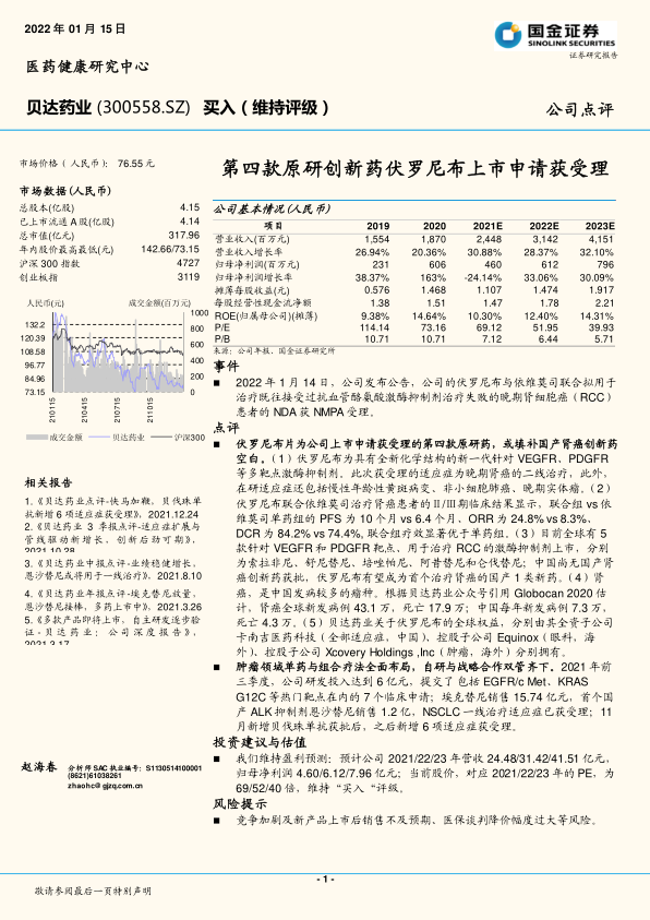 伏罗尼布片为公司上市申请获受理的第四款原研药,或填补国产肾癌创新药空白。(1)伏罗尼布为具有全新化学结构的新一代针对VEGFR、PDGFR等多靶点激酶抑制剂。此次获受理的适应症为晚期肾癌的二线治疗,此外,在研适应症还包括慢性年龄性黄斑病变、非小细胞肺癌、晚期实体瘤。(2)伏罗尼布联合依维莫司治疗肾癌患者的Ⅱ/Ⅲ期临床结果显示,联合组vs依维莫司单药组的PFS为10个月vs6.4个月、ORR为24.8%vs8.3%、DCR为84.2%vs74.4%,联合组疗效显著优于单药组。(3)目前全球有5款针对VEGFR和PDGFR靶点、用于治疗RCC的激酶抑制剂上市,分别为索拉非尼、舒尼替尼、培唑帕尼、阿昔替尼和仑伐替尼;中国尚无国产肾癌创新药获批,伏罗尼布有望成为首个治疗肾癌的国产1类新药。(4)肾癌,是中国发病较多的瘤种。根据贝达药业公众号引用Globocan2020估计,肾癌全球新发病例43.1万,死亡17.9万;中国每年新发病例7.3万,死亡4.3万。(5)贝达药业关于伏罗尼布的全球权益,分别由其全资子公司卡南吉医药科技(全部适应症,中国)、控股子公司Equinox(眼科,海外)、控股子公司XcoveryHoldings,Inc(肿瘤,海外)分别拥有。
