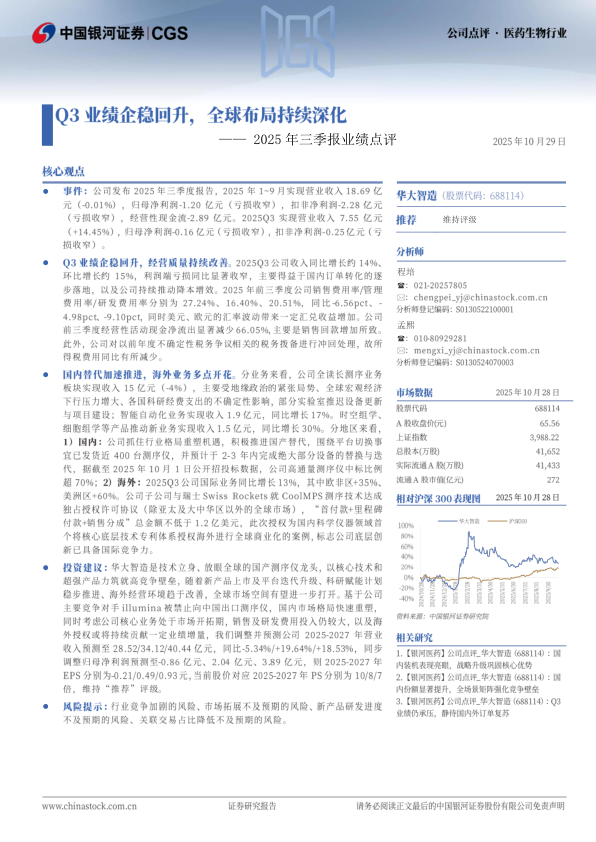 国内替代加速推进,海外业务多点开花。分业务来看,公司全读长测序业务板块实现收入15亿元(-4%),主要受地缘政治的紧张局势、全球宏观经济下行压力增大、各国科研经费支出的不确定性影响,部分实验室推迟设备更新与项目建设;智能自动化业务实现收入1.9亿元,同比增长17%。时空组学、细胞组学等产品推动新业务实现收入1.5亿元,同比增长30%。分地区来看,1)国内:公司抓住行业格局重塑机遇,积极推进国产替代,围绕平台切换事宜已发货近400台测序仪,并预计于2-3年内完成绝大部分设备的替换与迭代,据截至2025年10月1日公开招投标数据,公司高通量测序仪中标比例超70%;2)海外:2025Q3公司国际业务同比增长13%,其中欧非区35%、美洲区60%。公司子公司与瑞士SwissRockets就CoolMPS测序技术达成独占授权许可协议(除亚太及大中华区以外的全球市场),“首付款里程碑付款销售分成”总金额不低于1.2亿美元,此次授权为国内科学仪器领域首个将核心底层技术专利体系授权海外进行全球商业化的案例,标志公司底层创新已具备国际竞争力。