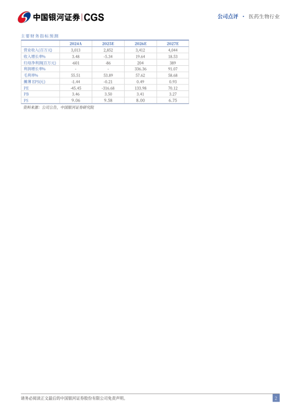 投资建议:华大智造是技术立身、放眼全球的国产测序仪龙头,以核心技术和超强产品力筑就高竞争壁垒,随着新产品上市及平台迭代升级、科研赋能计划稳步推进、海外经营环境趋于改善,全球市场空间有望进一步打开。基于公司主要竞争对手illumina被禁止向中国出口测序仪,国内市场格局快速重塑,同时考虑公司核心业务处于市场开拓期,销售及研发费用投入仍较大,以及海外授权或将持续贡献一定业绩增量,我们调整并预测公司2025-2027年营业收入预测至28.52/34.12/40.44亿元,同比-5.34%/19.64%/18.53%,同步调整归母净利润预测至-0.86亿元、2.04亿元、3.89亿元,则2025-2027年EPS分别为-0.21/0.49/0.93元,当前股价对应2025-2027年PS分别为10/8/7倍,维持“推荐”评级。