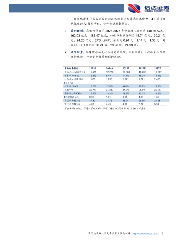 风险因素:地缘政治和关税不确定的风险;生物医药行业投融资不及预期的风险;行业竞争格局加剧的风险。