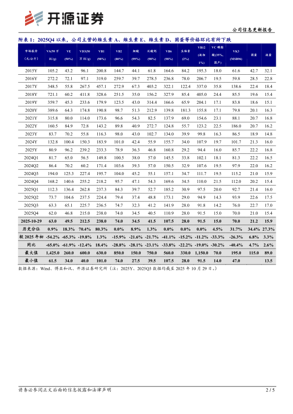 蛋氨酸景气上行助力盈利能力修复,稳步推进新项目、新产品带来成长动力(1)产品价格及盈利:据Wind和博亚和讯数据,2025Q3VA(50万IU/g)、VE(50%)、VD3(50万IU/g)、固蛋均价为63.3、65.1、225.7、22.7元/公斤,同比分别-67.4%、-48.0%、-0.7%、+7.8%,环比分别-14.1%、-37.8%、-4.9%、+0.5%;截至10月29日,VA、VE、VD3、固蛋市场价分别为63.0、49.5、212.5、21.2元/公斤,较2025年初分别-54.2%、-65.3%、-19.8%、+6.8%,同比分别-65.0%、-61.9%、-12.4%、+4.7%。蛋氨酸景气上行、公司30万吨蛋氨酸达产加上香精香料、新材料业务运行稳健,助力公司前三季度业绩高增、盈利能力同比提升。2025年前三季度公司销售毛利率、净利率分别为45.55%、32.17%,同比分别+6.01、+6.77pcts,相较2024年报分别+3.77、+4.88pcts;2025Q3销售毛利率、净利率分别为44.86%、31.27%,环比分别-0.26、+0.64pcts。(2)项目进展:公司18万吨/年液体蛋氨酸(折纯)项目目前已成功产出合格产品,公司还推出丝氨酸、色氨酸、胱氨酸等新产品,天津尼龙新材料项目目前正在推进,另外储备千亩土地规划建设香料项目,后续将结合市场情况推进HA项目及PPS扩产建设项目,储备项目丰富。我们认为,随着新项目、新产品的开发建设有序进行,公司成长动力充足。