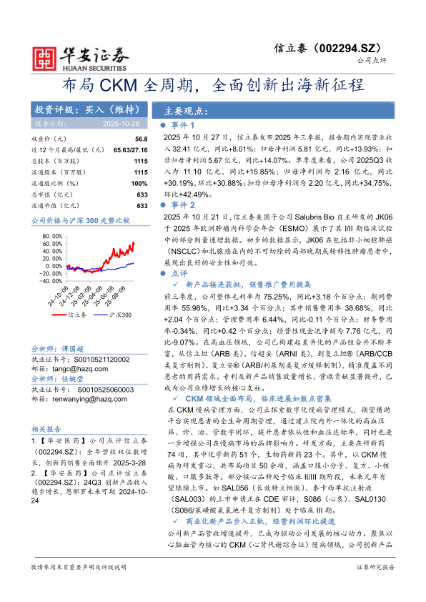 前三季度,公司整体毛利率为75.25%,同比+3.18个百分点;期间费用率55.98%,同比+3.34个百分点;其中销售费用率38.68%,同比+2.04个百分点;管理费用率6.44%,同比-0.11个百分点;财务费用率-0.34%,同比+0.42个百分点;经营性现金流净额为7.76亿元,同比-9.07%。在高血压领域,公司已构建起差异化的产品组合并不断丰富,从信立坦(ARB类)、信超妥(ARNI类),到复立坦®(ARB/CCB类复方制剂)、复立安®(ARB/利尿剂类复方缓释制剂),精准覆盖不同患者的用药需求。专利及新产品销售放量增长,营收贡献显著提升,已成为公司业绩增长的核心支柱。