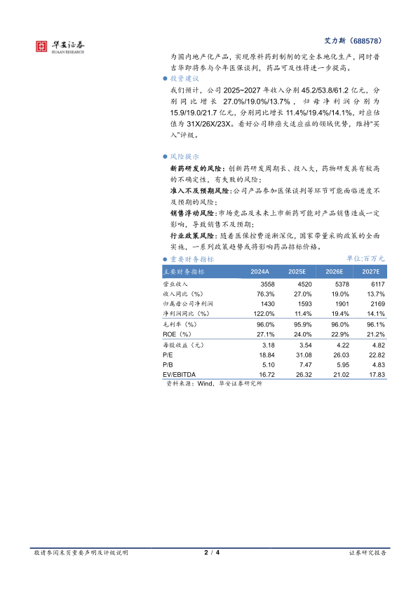 我们预计,公司2025~2027年收入分别45.2/53.8/61.2亿元,分别同比增长27.0%/19.0%/13.7%,归母净利润分别为15.9/19.0/21.7亿元,分别同比增长11.4%/19.4%/14.1%,对应估值为31X/26X/23X。看好公司肺癌大适应症的领域优势,维持“买入”评级。