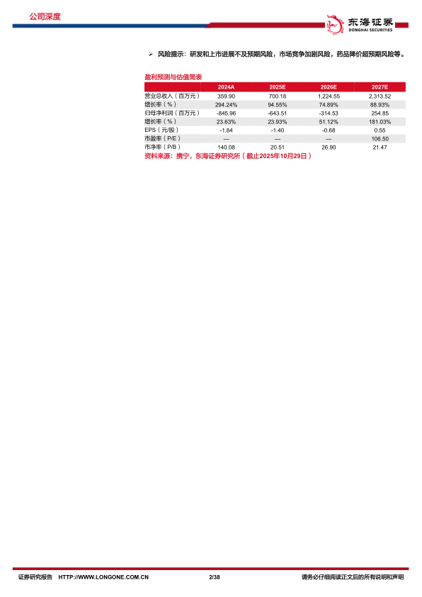 投资建议:公司研发能力和商业化能力均十分优秀,已有两款产品进入商业化阶段,核心产品舒沃替尼顺利实现出海,后续临床阶段的在研管线展示出了极高潜力。我们预测公司2025-2027年实现营收7.00、12.25、23.14亿元,归母净利润-6.44、-3.15、2.55亿元,首次覆盖,给予“买入”评级。